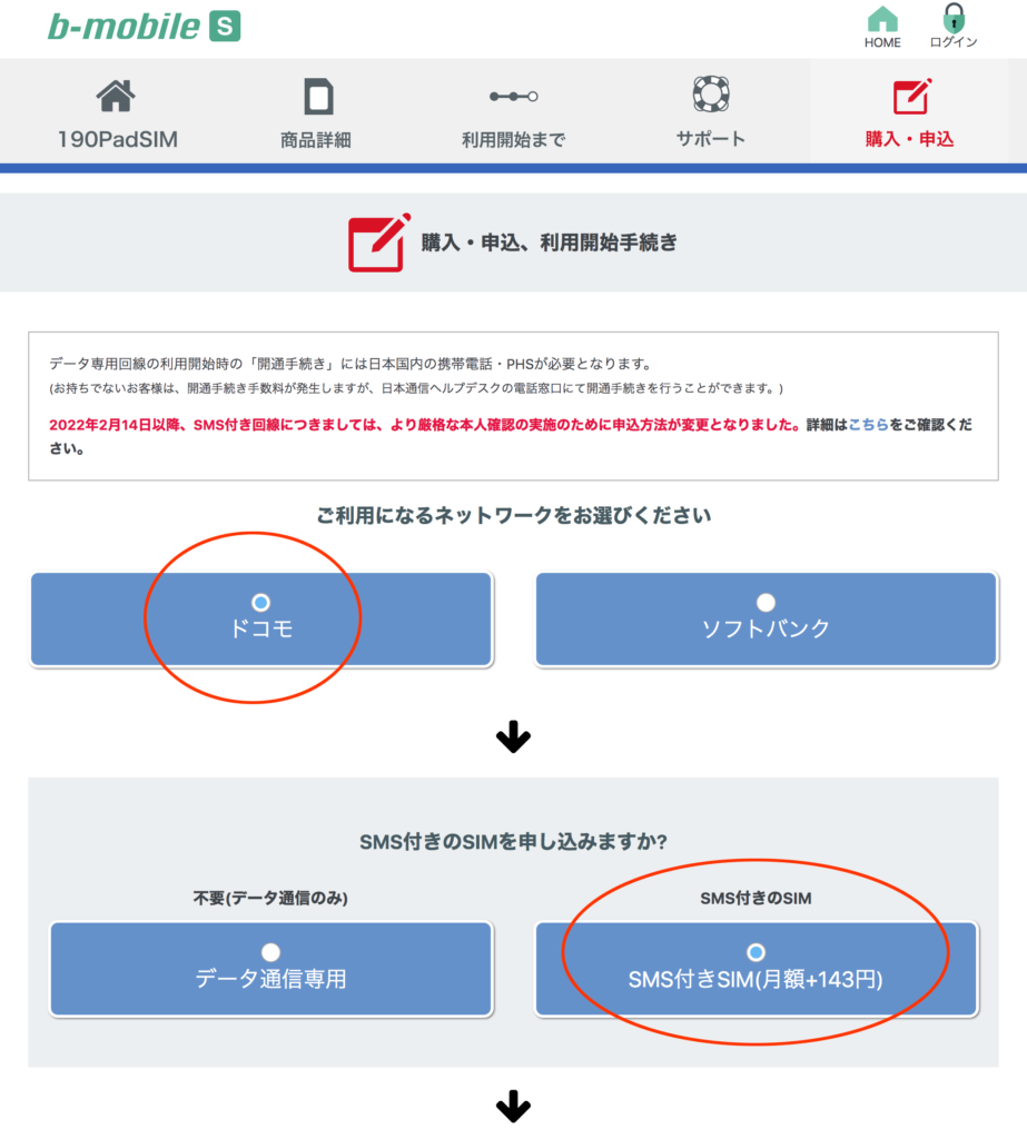 続いて「ドコモ」を選択、「SMS付きSIM(月額+143円)」を選択