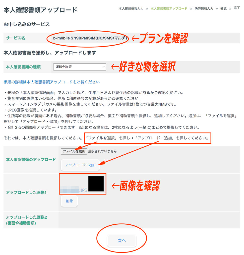 本人確認書類をアップロードします。ここでもサービス名を必ず確認してください。