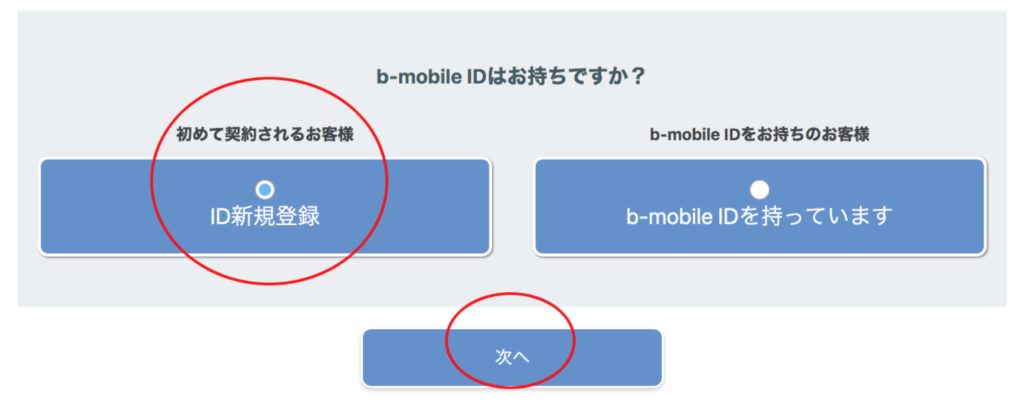 b-mobileを初めて購入する場合はID新規登録、すでにIDをお持ちの場合はIDを持っていますにチェックを入れて「次へ」をクリック
