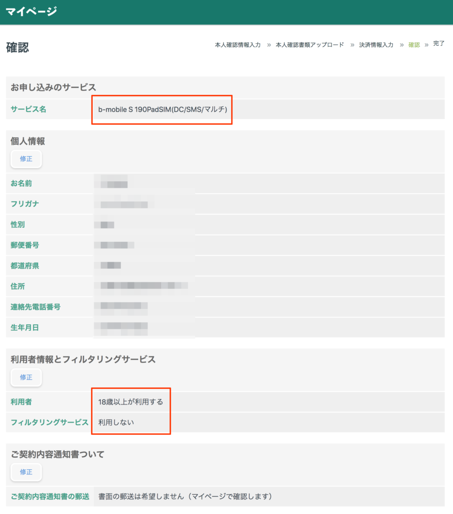 サービス名が「b-mobile S 190PadSIM(DC/SMS/マルチ)」になっている事を確認してから本人情報を入力します。